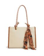 Bej renginin dinginliğini, taba rengi şeritler ve sapındaki desenli eşarp aksesuarıyla hareketlendiren, zamansız ve geniş omuz çantası.