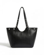 Gümüş renkli kuşgözü detaylı sapları ve kavisli modern formuyla şehrin ritmine ayak uyduran, geniş ve şık bir siyah omuz çantası.